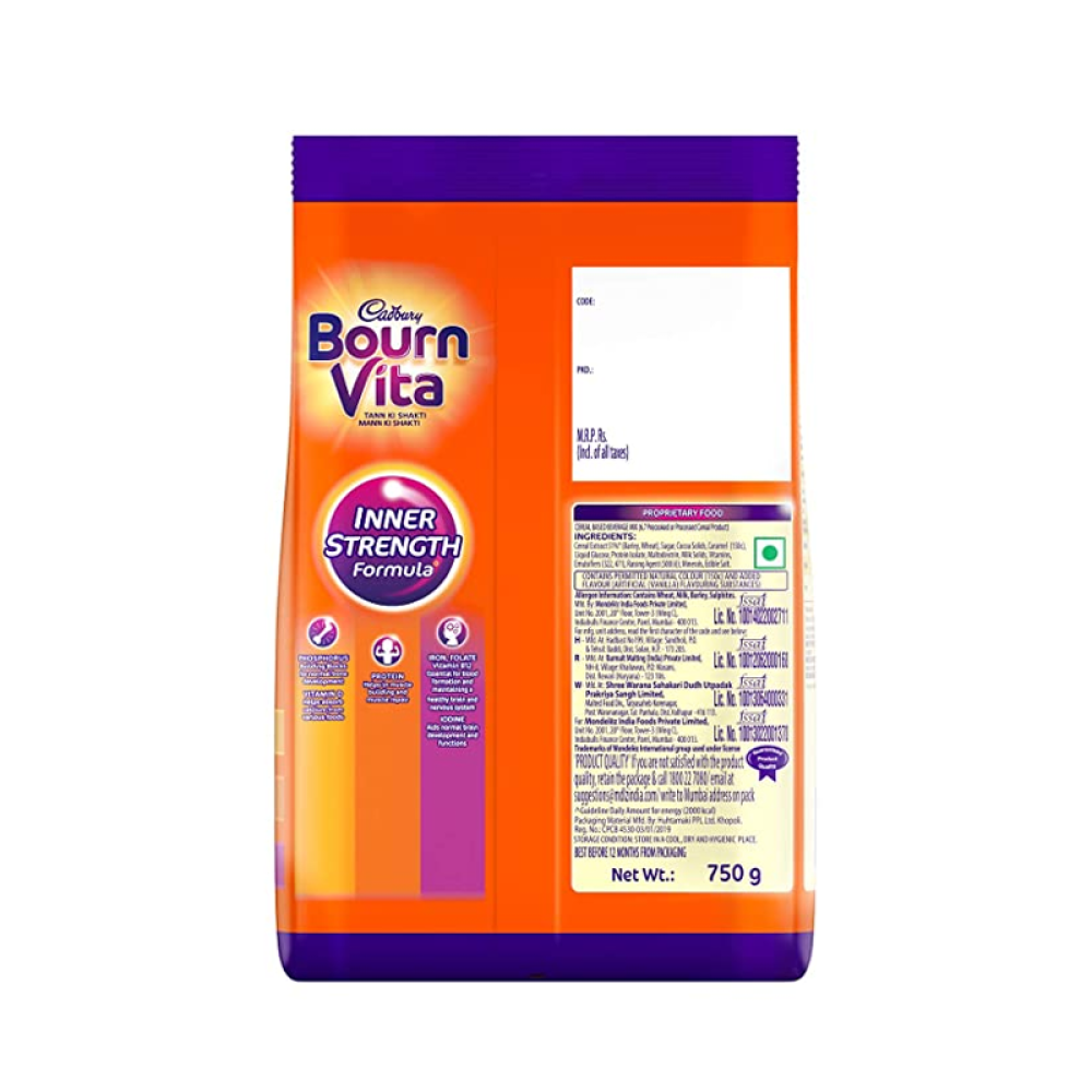 Malt-based health drink bourn Vita is a chocolate flavored powder, Its ingredients are: Malt Extract (44%), Sugar, Cocoa Solids, Milk Solids, Liquid Glucose, Emulsifiers (322, 471), Raising agent (500(ii)), Vitamins (D, B2, B9, B12), Minerals, Salt, Permitted natural color (150 c), Added flavors (Artificial Flavoring Substances).