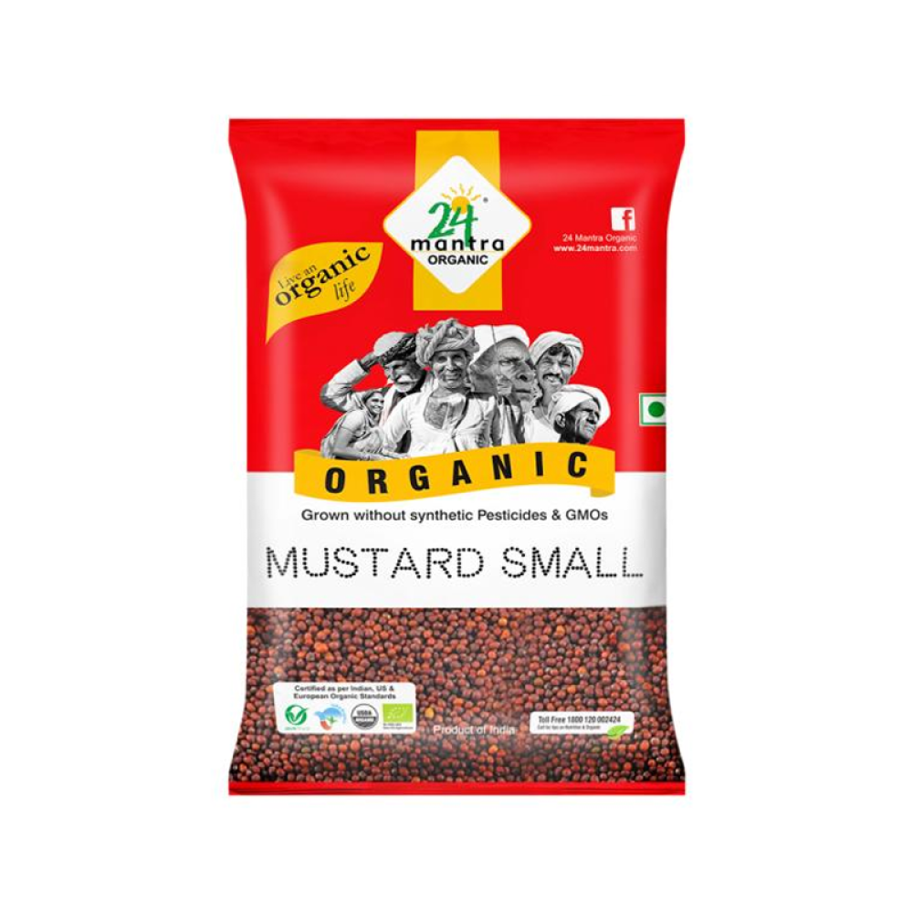 24 Mantra Organic-Organic Mustard Small 100g. Mustards belong to the cruciferous family; it is used as a seasoning in most south Indian dishes. It has fiber, protein, Vitamin C, K, Thiamin, Riboflavin, Niacin, Folate, calcium, Iron, Zinc, copper, Magnesium, Phosphorus, potassium, sodium, Manganese, and selenium. It has many beneficial properties.