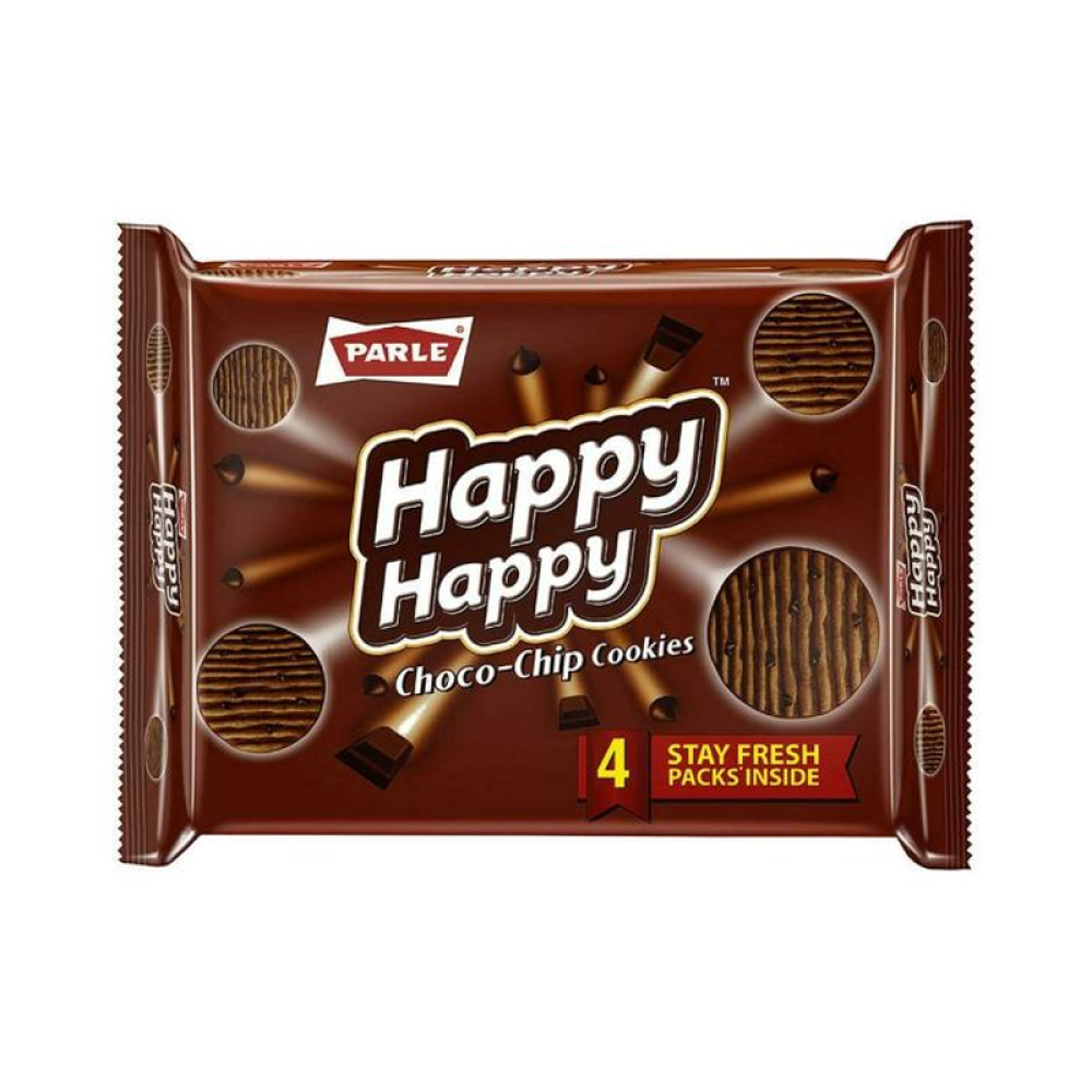 Parle Happy Happy Choco-Chip Cookies 4x100g, is a perfect tea time snack. Ingredients are refined wheat flour, sugar, refined palm oil, choco chips (8%), sugar, edible veg fat (hydrogenated oils), cocoa solids, flavoring substances, invert sugar syrup, raising agents, iodized salt, etc.
