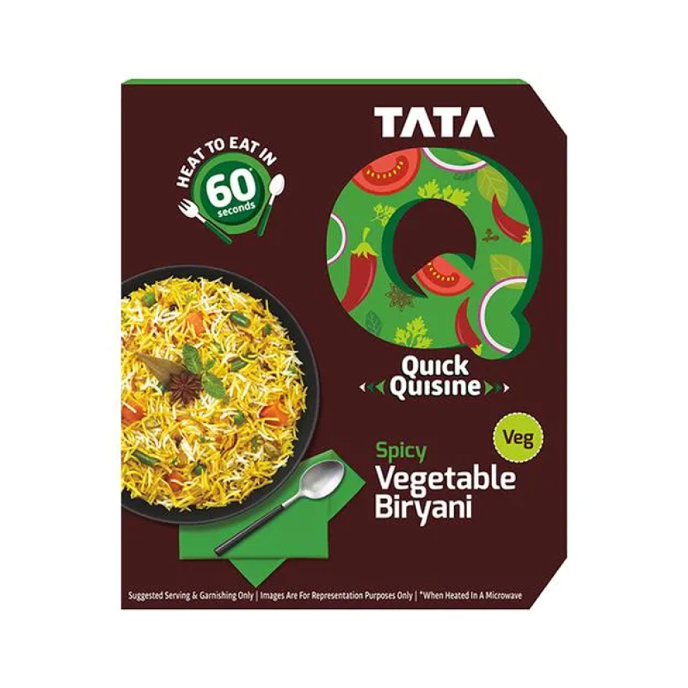 Tata Q ready to eat meal box veg biryani the ingredients are Cooked Rice (Water And Rice), Vegetables (13.8%) (Carrot, Onion, French Beans, Green Peas, Green Chilli Mint), Vegetable Biryani Masala (Salt, Mixed Spices, Maltodextrin, Hydrolysed Vegetable Protein (Soy Corn), Acidity Regulators &Ndash; (Ins 330 Ins 296), Flavor Enhancers &Ndash; Ins 627 Ins 631) Anticaking Agent &Ndash; Ins 551), Ghee, Edible Vegetable Oil (Sunflower), Fried Onion (Onion Edible Vegetable Oil (Sunflower)), Curd, Ginger Garlic Paste Caraway Seeds. Contains Added Natural Colour (Turmeric). Contains Added Natural (Masala) Nature Identical Flavour.